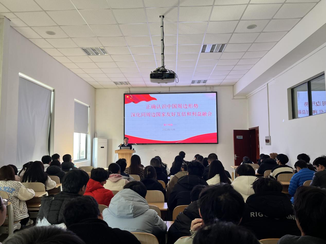 黄志刚以当前国际形势的基本态势为切入点,介绍我国开创周边经济外交等工作新局面,同时将继续主动作为、开拓创新,持续推进周边命运共同体建设。同时,启示广大同学要增强爱国情怀,掌握过硬的知识本领,自觉做国家安全的守护者。