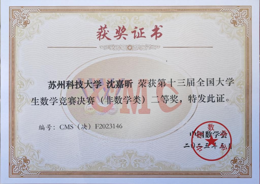 近日,在刚刚结束的第十三届全国大学生数学竞赛决赛中,我校应用物理学2018级沈嘉昕同学获得非数学专业组全国二等奖,这是我校在该项赛事中的最好成绩!本次竞赛共有来自全国各高校的218823人报名参赛,经过预赛选拔,仅有748名学生获得决赛资格。我校在全国(预赛)中获非数学专业组一等奖15项,二等奖17项,三等奖20项;数学专业组(B类)一等奖1项,二等奖11项,三等奖15项;沈嘉昕同学以非数学专业组全省第十名的成绩进入决赛。