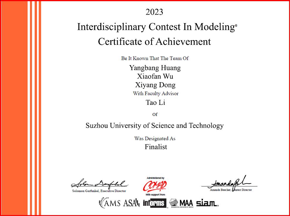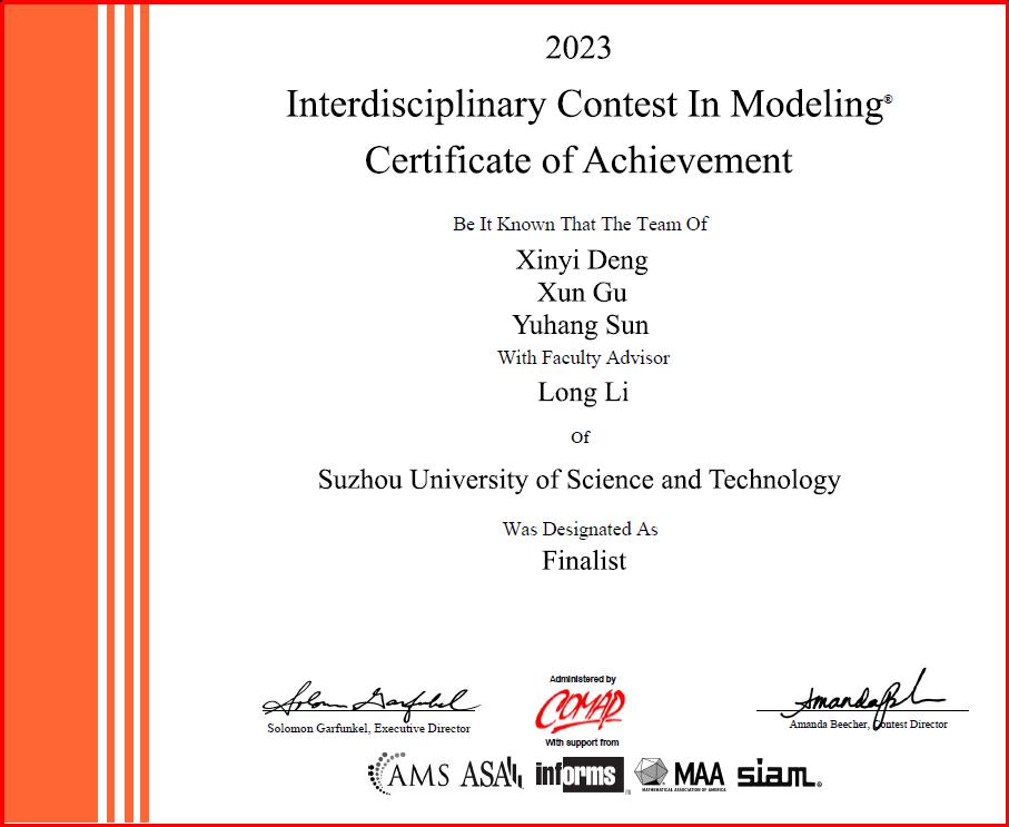 近日,2023年美国大学生数学建模竞赛结果揭晓!我校共组织31支队伍参赛,其中信息与计算科学专业黄泱邦、统计学专业吴晓凡、数学与应用数学专业董玺阳和信息与计算科学专业邓欣怡、统计学专业孙宇航、计算机科学与技术专业顾迅6名同学组成的两支队伍各获1项特等奖提名奖(Finalist)。另外,我校学生还获得一等奖(Meritorious Winners) 4项,二等奖 (Honorable Mentions) 4项,获奖数量和等级均创历史新高。