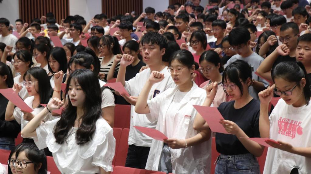 在夏清妍同学的带领下,全体新生许下铿锵有力的青春誓言。