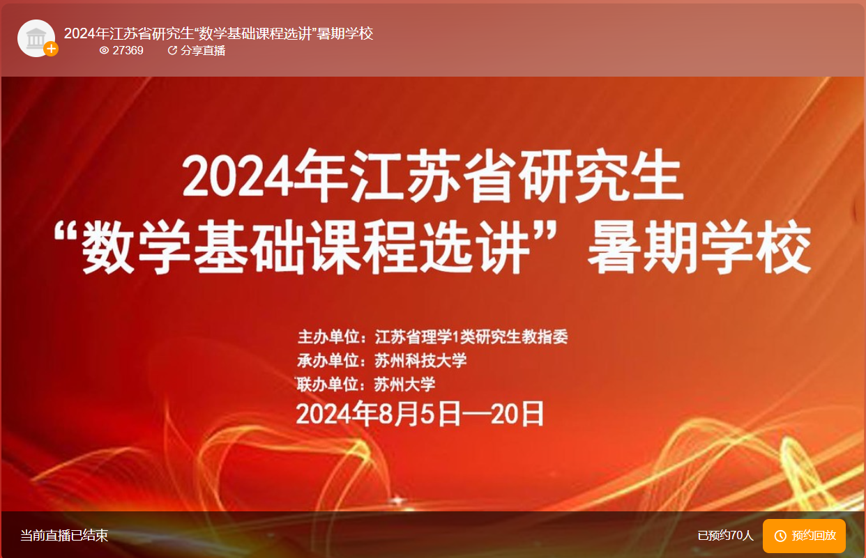 本次暑期学校共开设了《实分析》、《代数学》、《拓扑学》、《微分流形》和《微分方程》5门研究生数学基础课程,由苏州大学和苏州科技大学教学经验丰富的专业教师共同执教,并邀请了南京大学数学学院国家杰出青年科学基金获得者喻良教授、同济大学数学学院教授颜启明教授开设讲座,分别以“随机性与不可解性”、“值分布理论与丢番图逼近中的‘活动目标’问题”为题,围绕基础数学和应用数学等相关数学学科方向及其应用前沿给学生带来精彩的报告。课程教学采用线上线下同步直播的方式进行,线下上课地点设在苏州科技大学石湖校区,线上采用“蔻享学术”进行直播,共有来自江苏省内外各高校的50余位研究生参加线下学习, 2万7千余人次观看线上直播。