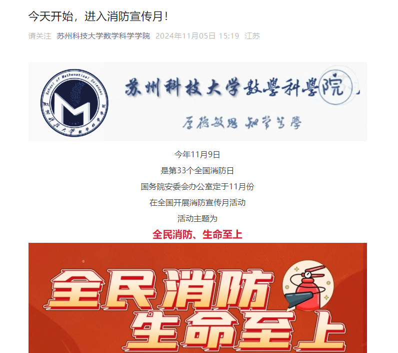 防患未“燃”,宣传先行。学院通过教职工大会、班会、微信公众号推送等形式,做好消防安全知识的宣传,旨在提高师生们的消防安全意识,增强自我保护能力,深刻理解“全民消防、生命至上”的重大意义。