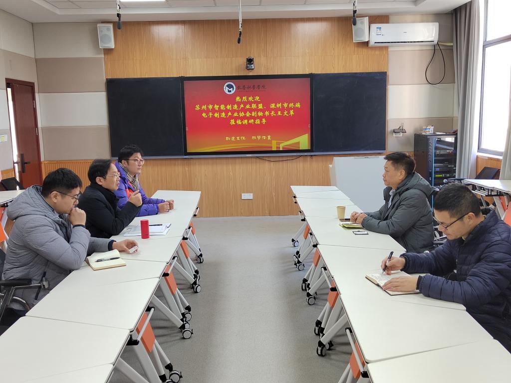 1月2日,苏州市智能制造产业联盟、深圳市终端电子制造产业协会副秘书长王文革来院开展产学研对接活动。学院院长黄志刚、专任教师翟晓凯、毕永成等参加了活动。