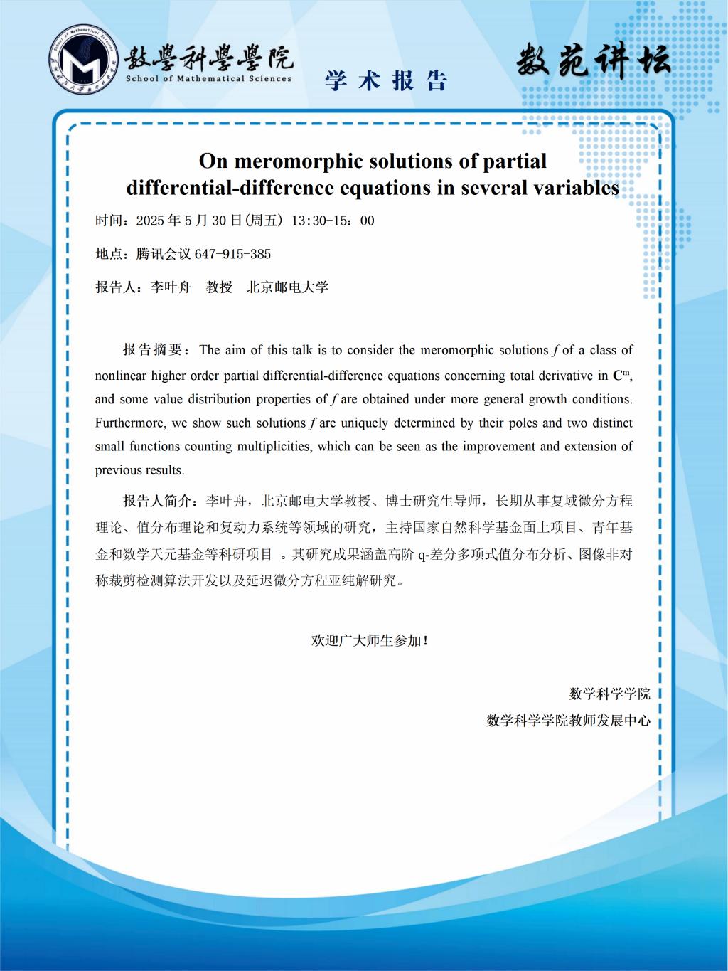 【数苑讲坛】第十七讲:On meromorphic solutions of partial differential-difference equations in several variables