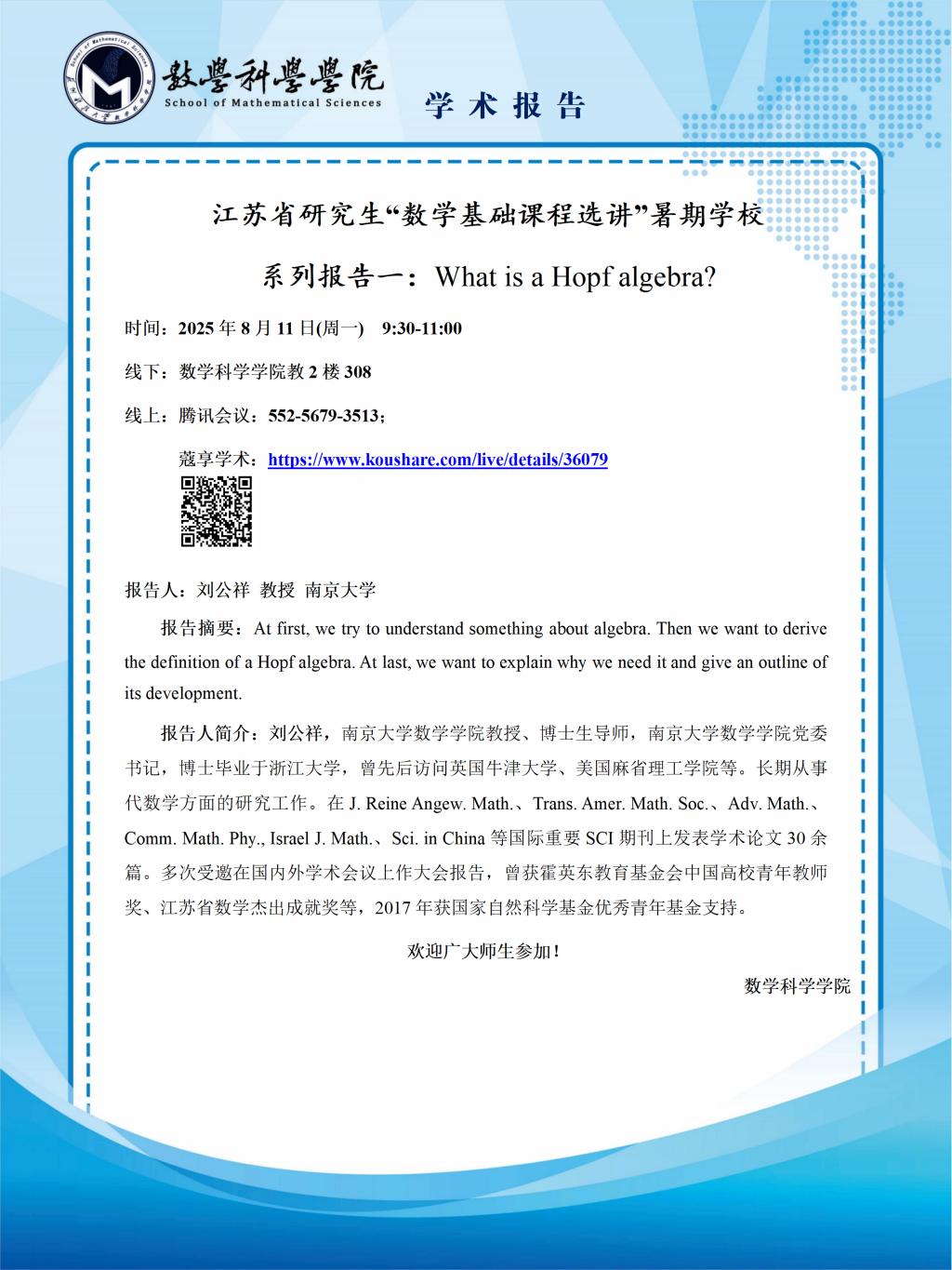 江苏省研究生“数学基础课程选讲”暑期学校 系列报告一:What is a Hopf algebra?